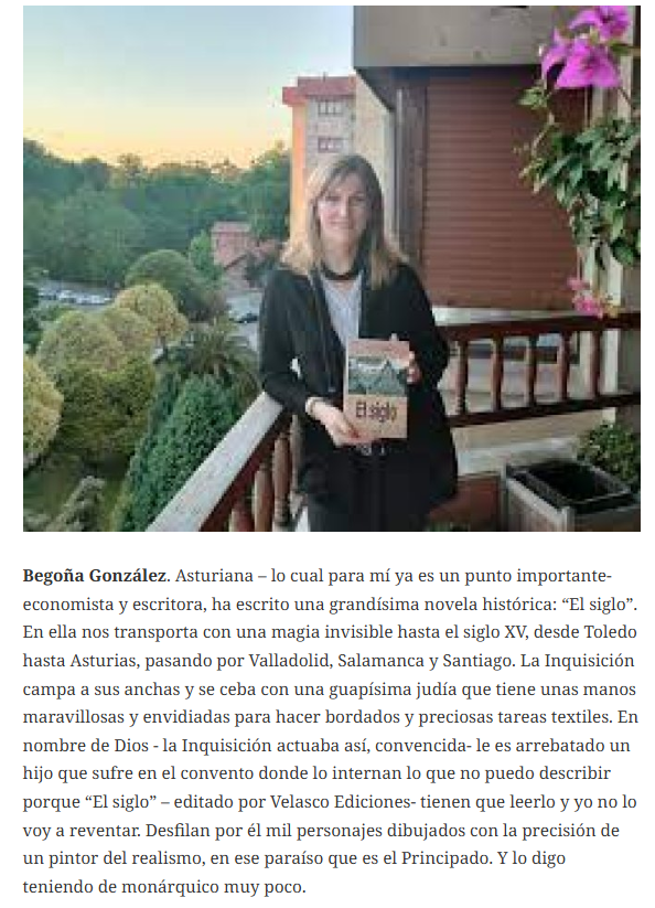 Begoña González. Asturiana – lo cual para mí ya es un punto importante- economista y escritora, ha escrito una grandísima novela histórica: “El siglo”. En ella nos transporta con una magia invisible hasta el siglo XV, desde Toledo hasta Asturias, pasando por Valladolid, Salamanca y Santiago. La Inquisición campa a sus anchas y se ceba con una guapísima judía que tiene unas manos maravillosas y envidiadas para hacer bordados y preciosas tareas textiles.
